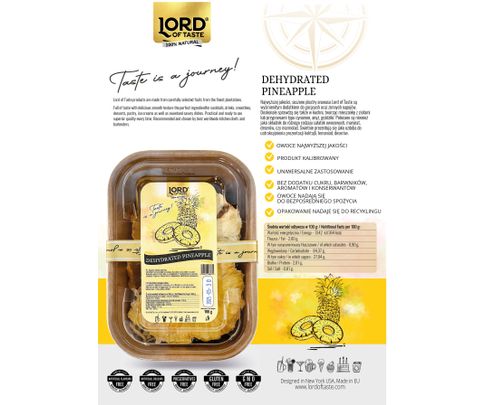 Najwyższej jakości, suszone plastry ananasa Lord of Taste są wyśmienitym dodatkiem do gorących oraz zimnych napojów. Doskonale sprawdzą się także w kuchni, tworząc mieszankę z ziołami śródziemnomorskimi lub przyprawami typu cynamon, anyż, goździki.