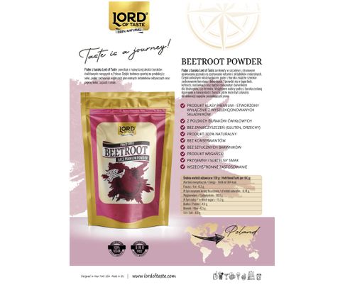 większość pierwotnych składników odżywczych oraz piękny kolor, zapach i smak. Puder z buraka Lord of Taste zamknięty w szczelnym, strunowym opakowaniu pozwala na zachowanie witamin i składników mineralnych. Dzięki unikalnym właściwościom, puder z buraka znajdzie szerokie zastosowanie barwiące i dekorujące. Sprawdzi się w jogurtach, kefirach, maślankach oraz będzie doskonałym barwnikiem dla biszkoptów, czy kremów. Wyjątkowe walory pudru z buraka zostaną docenione w kawiarniach i barach, gdzie może być