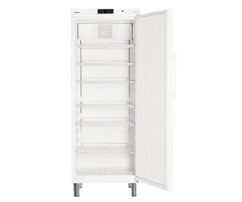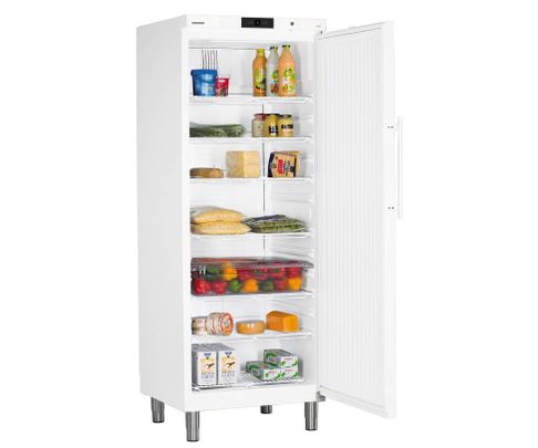 Profesjonalna szafa chłodnicza GKv 6410 marki LIEBHERR o pojemności całkowitej 663 l. Pojemność użytkowa 499 l. Komora dostosowana do pojemników GN 2/1. W wyposażeniu 6 rusztowanych półek pokrytych powłoką z tworzywa. Obudowa z blachy malowanej na kolor biały, wnętrze wykonane z tworzywa sztucznego w kolorze białym.
