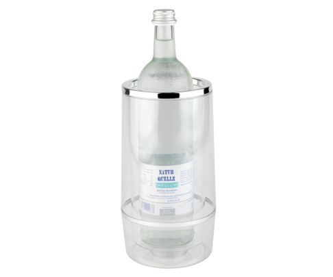 Pojemnik z podwójną ścianką. Wykonany z przeźroczystego plastiku z ozdobnymi chromowanymi krawędziami. Średnica wewnątrz pojemnika wynosi 100 mm. Produkt nie nadaje się do mycia w zmywarkach.