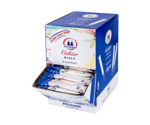 Cukier biały pakowany w podłużne estetyczne saszetki. Wykorzystywany w hotelach, restauracjach, punktach gastronomicznych i w biurach. Ułatwia zachowanie higieny. Dzięki poziomemu rozcięciu na froncie kartonu tworzy się wygodna, uchylna kieszeń, przez którą można sięgać po saszetki.
