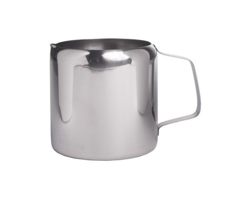 Stalowy dzbanek z uchwytem do podawania mleka. Wygodny uchwyt pozwala na sprawne posługiwanie się dzbankiem.