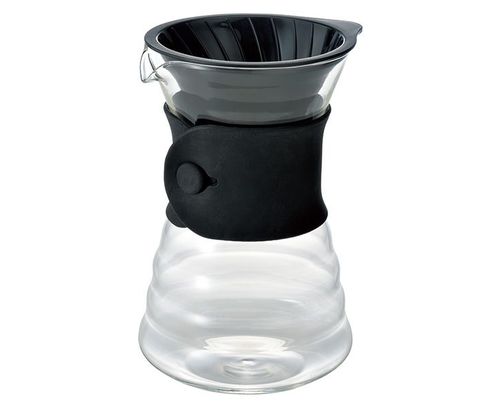 Hario Drip Decanter to bardzo ciekawe urządzenie, które składa się z filtra typu V60 z typowymi dla dripów Hario kanalikami oraz szklanej, odpornej na ciepło karafki na kawę z wygodnym silikonowym uchwytem. Taki zestaw pozwala na zaparzanie i podawanie kawy przy pomocy jednego naczynia.