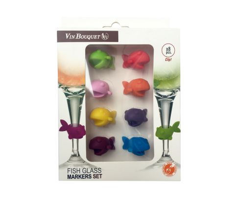 Rybki dekoracyjne służące do oznakowania kieliszków. Opakowanie zawiera 8 sztuk w różnych kolorach.