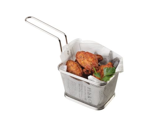 Praktyczny, prostokątny koszyczek do serwowania potraw. Szczególnie polecany do restauracji typu fast food. Można w nim smażyć potrawy na oleju. Współgrającym i nieodzownym z koszyczkiem elementem jest papier pergaminowy. Wygodny uchwyt pozwala na łatwe przemieszczanie się z nim i serwowanie potraw.