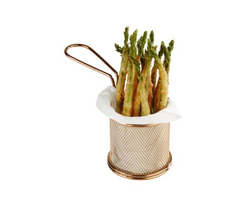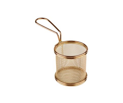 Praktyczny, okrągły koszyczek w kolorze złotym do serwowania potraw. Szczególnie polecany do restauracji typu fast food. Można w nim smażyć potrawy na oleju. Współgrającym i nieodzownym z koszyczkiem elementem jest papier pergaminowy. Wygodny uchwyt pozwala na łatwe przemieszczanie się z nim i serwowanie potraw.
