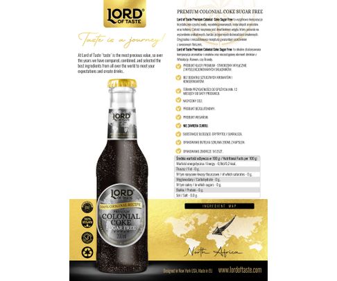Lord of Taste Premium Colonial Coke towyjątkowa kompozycja krystalicznie czystej wody, wyselekcjonowanych, naturalnych aromatów oraz kofeiny. Całość nasycona jest dwutlenkiem węgla, który pozwala na wyzwolenie unikatowych, bardzo przyjemnych doświadczeń smakowych. Oryginalna i nieszablonowa receptura gwarantuje orzeźwienie z owocowym finiszem. Lord of Taste Premium Colonial Coke to idealne zbalansowana kompozycja aromatów i smaków oraz niezastąpiony element drinków z Whisk(e)y, Rumem, czy Brandy.
