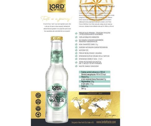Lord of Taste Premium Elderflower Tonic Water to wyjątkowa mieszanka krystalicznie czystej wody oraz ekstraktu z kwiatu czarnego bzu, który zbierany jest tylko przez dwa dni w roku na Mazowszu. Kompozycja ta, została wzbogacona o naturalne ekstrakty chininy pozyskiwanej z kory Chinowca. Całość nasycona jest dwutlenkiem węgla, który pozwala na wyzwolenie unikatowych, bardzo przyjemnych kwiatowych aromatów. Lord of Taste Premium Elderflower Tonic