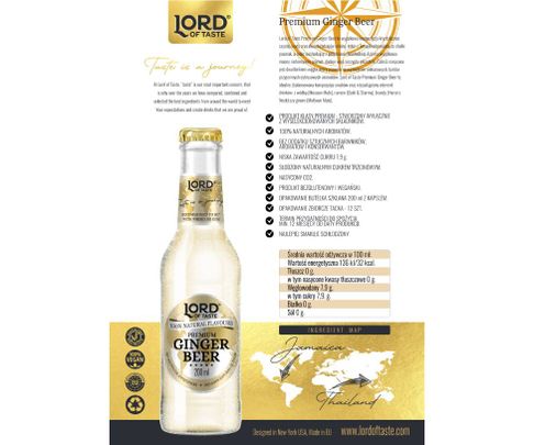 Lord of Taste Premium Ginger Beer to wyjątkowa kompozycja krystalicznie czystej wody oraz dwóch rodzajów imbiru. Imbir z Jamajki odpowiada za słodki posmak, a imbir pochodzący z południowo-wschodniej Azji ma wyjątkowo mocny i intensywny aromat, dodaje więc szczypty pikanterii. Całość nasycona jest dwutlenkiem węgla, który pozwala na wyzwolenie unikatowych, bardzo przyjemnych cytrusowych aromatów. Lord of Taste Premium Ginger Beer to idealne zbalansowana kompozycja smaków oraz niezastąpiony element drinków: z wódką (Moscow Mule), rumem (Dark & Stormy), brandy (Horse’s Neck) czy ginem (Midtown Mule).