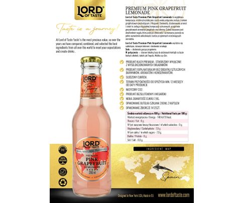 Lord of Taste Premium Pink Grapefruit Lemoniada to wyjątkowa kompozycja, w którejkrystalicznie czysta woda połączona zostaje z sokiem grejpfrutowym pochodzącym z Hiszpanii.
