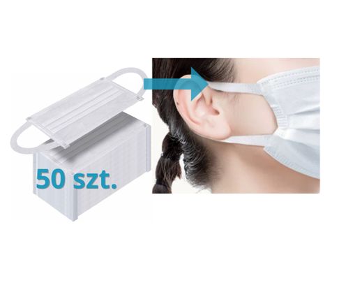 Maseczka ochronna 3-warstwowa antywirusowa, antybakteryjna i przeciwpyłowa. Zapewnia skuteczność filtracji BFE >95%. Rozmiar uniwersalny 17,5 × 9,5 cm. Maseczka posiada certyfikat CE zgodny z Europejską normą EN149:2001+A1:2009. 100% włóknina polipropylenowa (nie zawiera latexu). Rekomendowane użycie jednorazowe, maskę można sterylizować. Typ/klasa ochrony: chirurgiczna FFP1. Opakowanie 50 sztuk. Kolor biały.