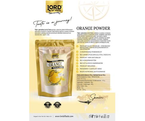 Puder z pomarańczy Lord of Taste powstaje z najwyższej jakości liofilizowanych pomarańczy rosnących w Hiszpanii. Dzięki technice opartej na suszeniu