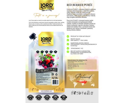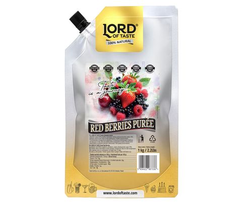 Puree Lord of Taste z czerwonych owoców to unikatowa, najwyższej jakości kompozycja, w skład której wchodzą maliny, truskawki, wiśnie oraz czarne porzeczki.