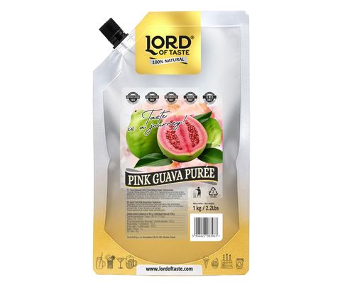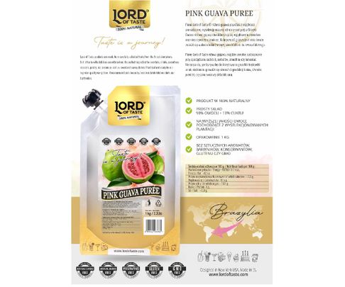 Puree Lord of Taste różowa gujawa powstaje z wyjątkowo aromatycznej, wyselekcjonowanej odmiany rosnącej w Brazylii. Owoce różowej gujawy charakteryzują się wyjątkowym aromatem oraz nieoczywistym smakiem. Kaloryczność gujawy jest niska i może znaleźć się w diecie kobiet w ciąży jako źródło m. in. kwasu foliowego.