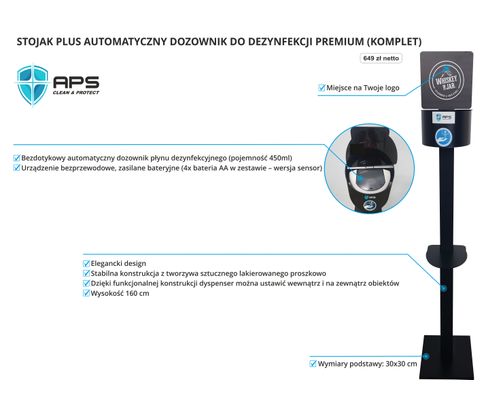Stojak + automatyczny dozownik do dezynfekcji premium. Elegancka, stabilna konstrukcja. Stojak posiada miejsce na logo. Bezdotykowy automatyczny dozownik (dyspenser) do mydła, żelu, płynu dezynfekującego oraz mydła w płynie. Posiada inteligentny czujnik podczerwieni. Charakteryzuje się automatyczną i bezdotykową obsługą. Wykonany z wysokiej jakości plastiku abs. Dzięki funkcjonalnej konstrukcji dyspenser można ustawić wewnątrz i na zewnątrz obiektów.