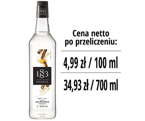 Syrop marki 1883 Routin dodaje autentyczny aromat pikantnego ajerkoniaku, oferuje intensywny, bogaty, jedwabisty smak kremu wzmocniony nutami wanilii, cynamonu i rumu. Bezalkoholowy i wytwarzany ze starannie dobranych składników syrop składa się z czystego cukru trzcinowego i jego tajnego składnika, czystej wody z Alp.