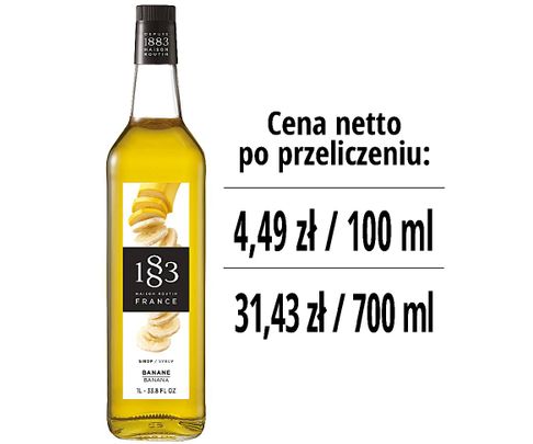 Syrop bananowy 1883 charakteryzuje się głębokim złotożółtym kolorem i intensywnym aromatem świeżego banana otoczonego nutami zielonego melona, ??ananasa, wanilii i rumu. Wyprodukowany ze starannie wyselekcjonowanych składników syrop 1883 Banana zawiera czysty sok bananowy połączony z mineralnością czystej wody alpejskiej.