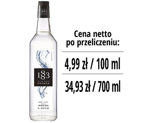 Dzięki słodkiemu i subtelnemu zapachowi skórki pomarańczowej syrop Triple Sec 1883 oddaje całą intensywność słynnego likieru pomarańczowego z lekkim i cytrynowym smakiem. Bezalkoholowy i wytwarzany ze starannie dobranych składników, syrop Triple Sec 883 składa się z czystego cukru trzcinowego i jego sekretnego składnika, czystej wody z Alp.