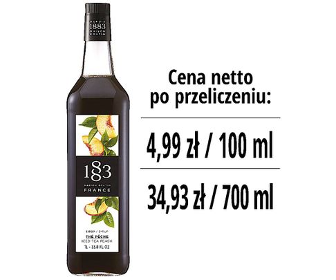 Dzięki intensywnemu, owocowemu aromatowi dojrzałej brzoskwini, syrop herbata brzoskwiniowa 1883 rozwija intensywny smak dojrzałej żółtej brzoskwini podążającej za orzeźwiającym czarnym wykończeniem herbaty. Syrop herbata brzoskwiniowa 1883 jest wykonany ze starannie wyselekcjonowanych składników, w tym naturalnego cukru trzcinowego i naszego sekretnego składnika, czystej wody alpejskiej.