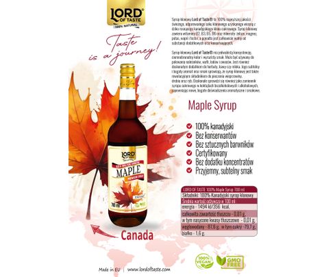 Syrop klonowy Lord of Taste to 100% najwyższej jakości świeżego, odparowanego soku klonowego uzyskanego wiosną z dziko rosnącego kanadyjskiego klonu cukrowego.
