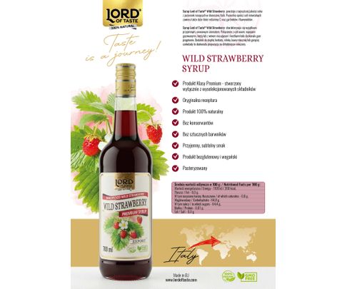 Syrop Lord of Taste Wild Strawberry powstaje z najwyższej jakości soku z poziomek rosnących w słonecznej Italii. Poziomka oprócz soli mineralnych zawiera także duże ilości witaminy C oraz garbników i flawonoidów.