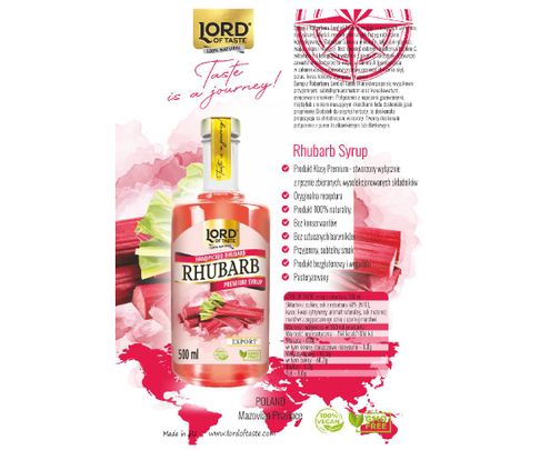 Syrop z Rabarbaru Lord of Taste powstaje z rosnących w Polsce, najwyższej jakości, ręcznie zbieranych łodyg rabarbaru kędzierzawego. Rabarbar zawiera minerały, takie jak magnez, wapń, potas i mangan. Jest również dobrym źródłem witaminy C, witaminy K i kompleksu witamin z grupy B. Składniki odżywcze zawarte w rabarbarze to wapń, witamina A (pomagająca w zahamowaniu procesów przedwczesnego starzenia się), potas, kwas foliowy, mangan i magnez.