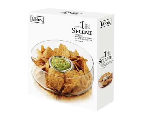 Duży talerz z wysokim brzegiem może służyć do serwowania chipsów, chrupek oraz innych przekąsek. Szklana misa posiada wewnątrz dodatkowe naczynie które można wypełnić sosem bądź dipem.