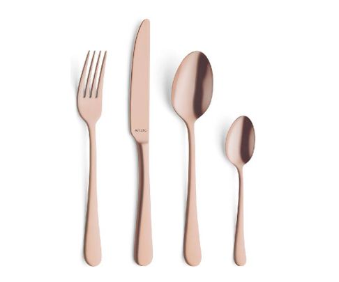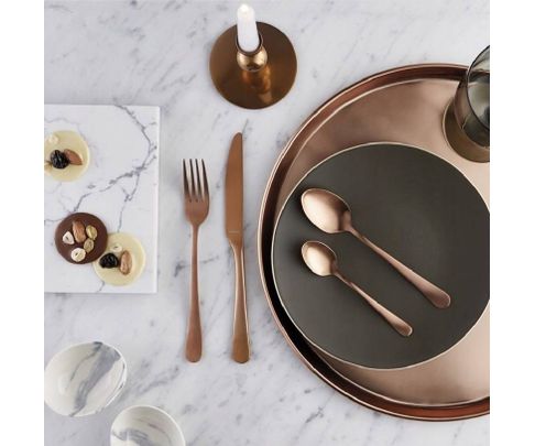 Ta wyjątkowa seria sztućców z miedzianym wykończeniem tworzy efekt vintage na stali nierdzewnej.