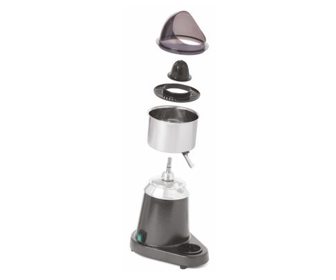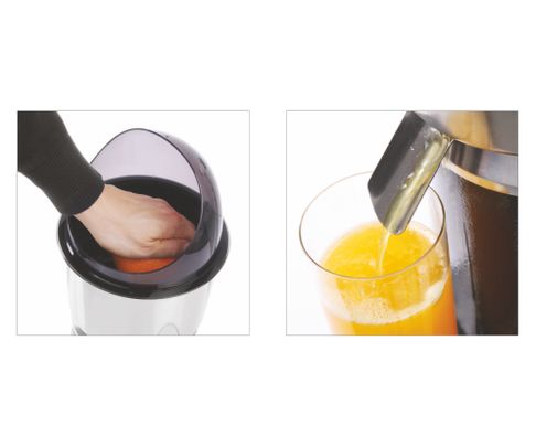 Bardzo wydajna elektryczna wyciskarka do cytrusów. Działa poprzez kombinację ręcznego docisku i obrotowego stożka wyciskającego napędzanego elektrycznie. Wyciskarka posiada manualne sterowanie za pomocą przycisku on/off. Maszyna wyposażona jest w trzy wymienne nakładki stożkowe. Rozwiązanie to pozwala na szybkie przejście na owoce o innej średnicy. Pojemnik na sok wykonany jest ze stali nierdzewnej, sitko wykonane z tworzywa abs. Dodatkowo wyposażona w osłonę antyrozpryskową. Wszystkie elementy, oprócz obudowy można myć w zmywarkach.