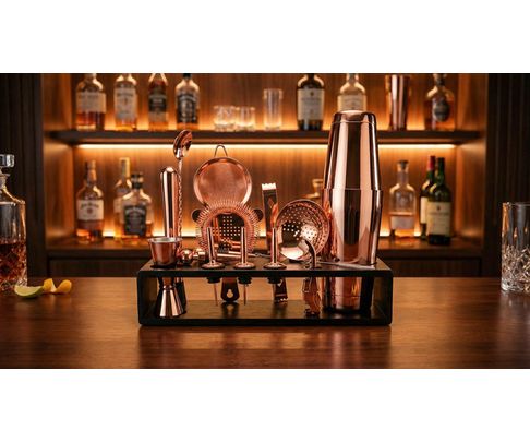 Podnieś poziom swoich domowych koktajli i poczuj się jak profesjonalny barman dzięki eleganckiemu, 16-elementowemu zestawowi barmańskiemu w wyjątkowym kolorze miedzianym. To nie tylko praktyczny komplet akcesoriów, ale również stylowa ozdoba kuchni, baru lub salonu.