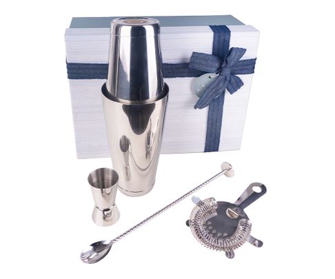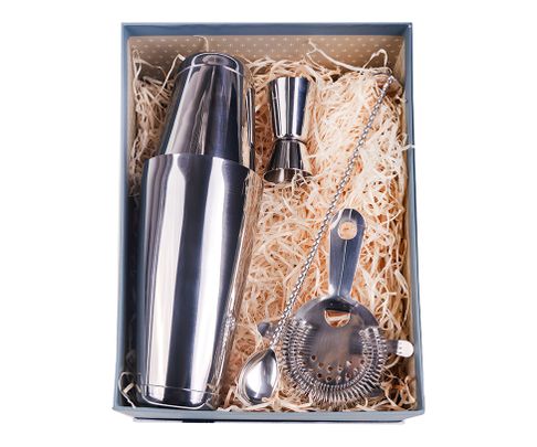 Zestaw prezentowy barmański w skład, którego wchodzą: shaker 2-częściowy Tin-Tin 700ml ze stali nierdzewnej, łyżka barmańska, miarka barmańska 20/40ml (jigger) oraz standardowe sitko barmańskie. Zestaw świetnie sprawdzi się jako prezent, zapakowany jest w eleganckie, prezentowe pudełko.